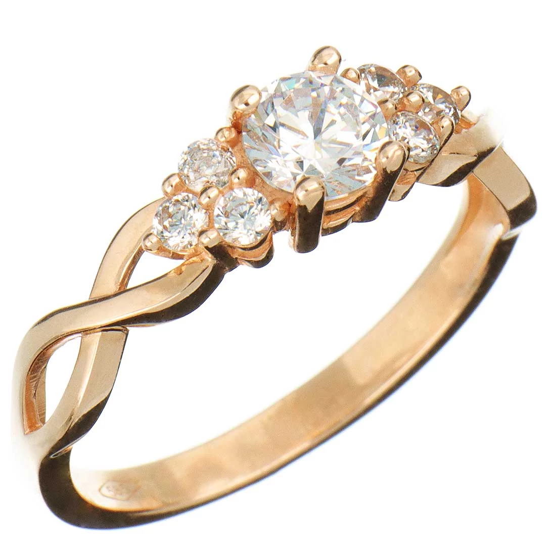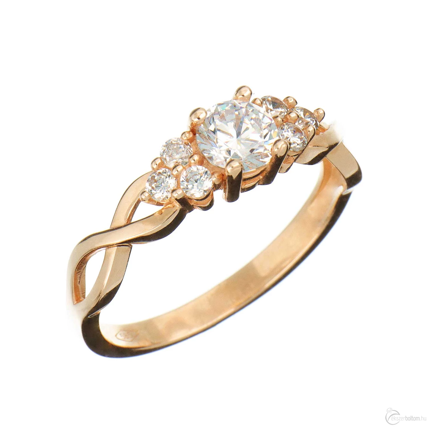 Eljegyzési gyűrű (más néven szoliter, leánykérő vagy kísérő gyűrű) egyetlen nagyobb és hat kisebb kerek, fehér cirkónia kővel, négykarmos foglalatban, 14 karátos rozé (rózsa, vörös) aranyból. A gyűrűsín végtelen motívummá fonódik, ami a megjelenését különösen elegánssá és érdekessé teszi. A karmos foglalat megfelelő fényt biztosít a köveknek. A gyűrűsín felső része belül könnyített.