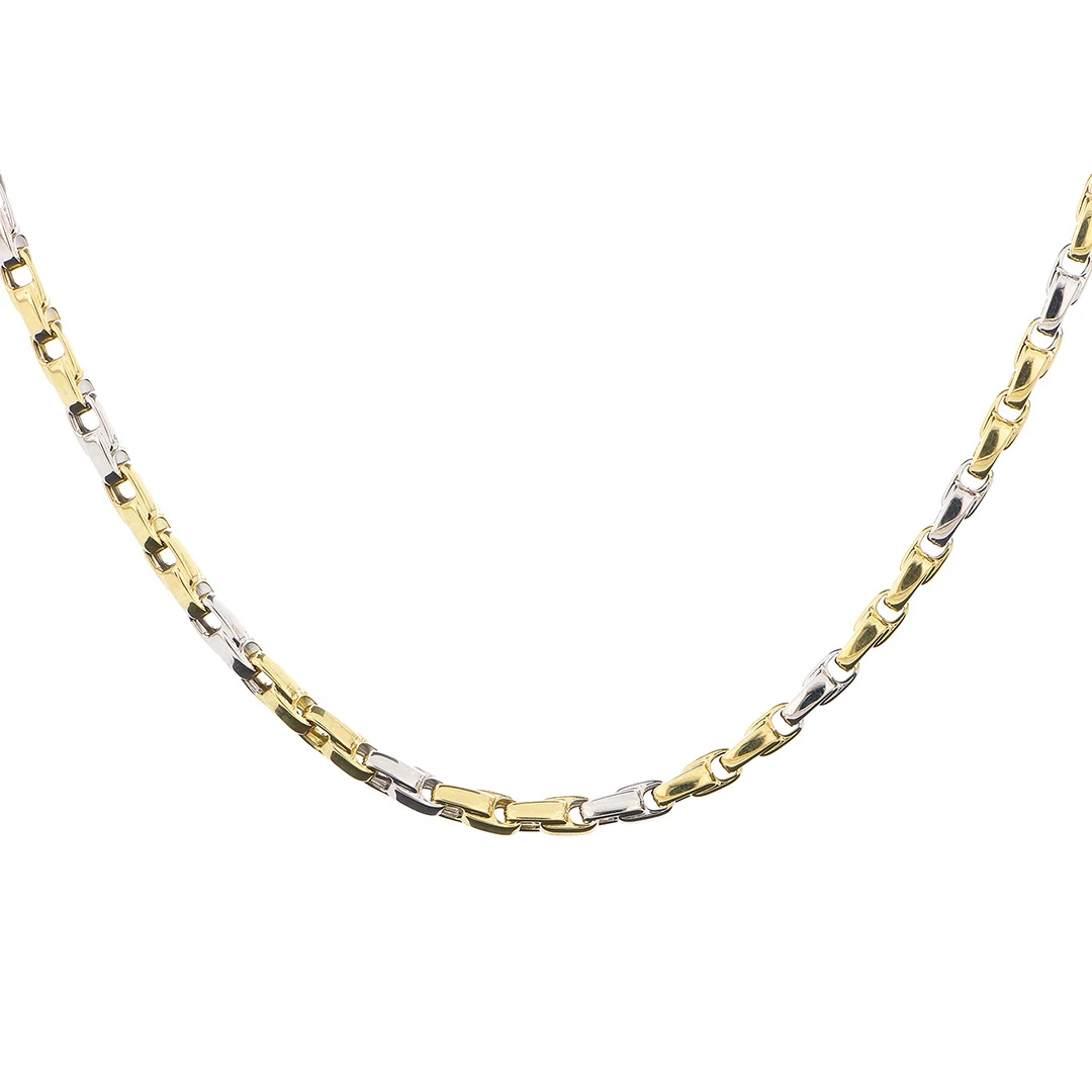 Erőteljes megjelenésű, sárga-fehér 14 karátos aranyból készült üreges divat nyaklánc, főleg férfiaknak. A dupla kialakítású anker szemek természetes módon kapcsolódnak egymásba. A lánc ettől erős, tartós, mivel a korábban divatos, de gyakran elkopó stiftelés nélkül készült. Letisztult megjelenése jó ízlésről, státuszról mesél, erős szemei az üreges kivitel ellenére tartósak, a szokásos üreges láncoknál védettebbek. A lánc egyedi kialakítású karabinerrel záródik, amely erős és megbízható, mégsem az a fajta tucatmegoldás, amely az ilyen egyedi tervezésű láncoknál illúzióromboló lenne.