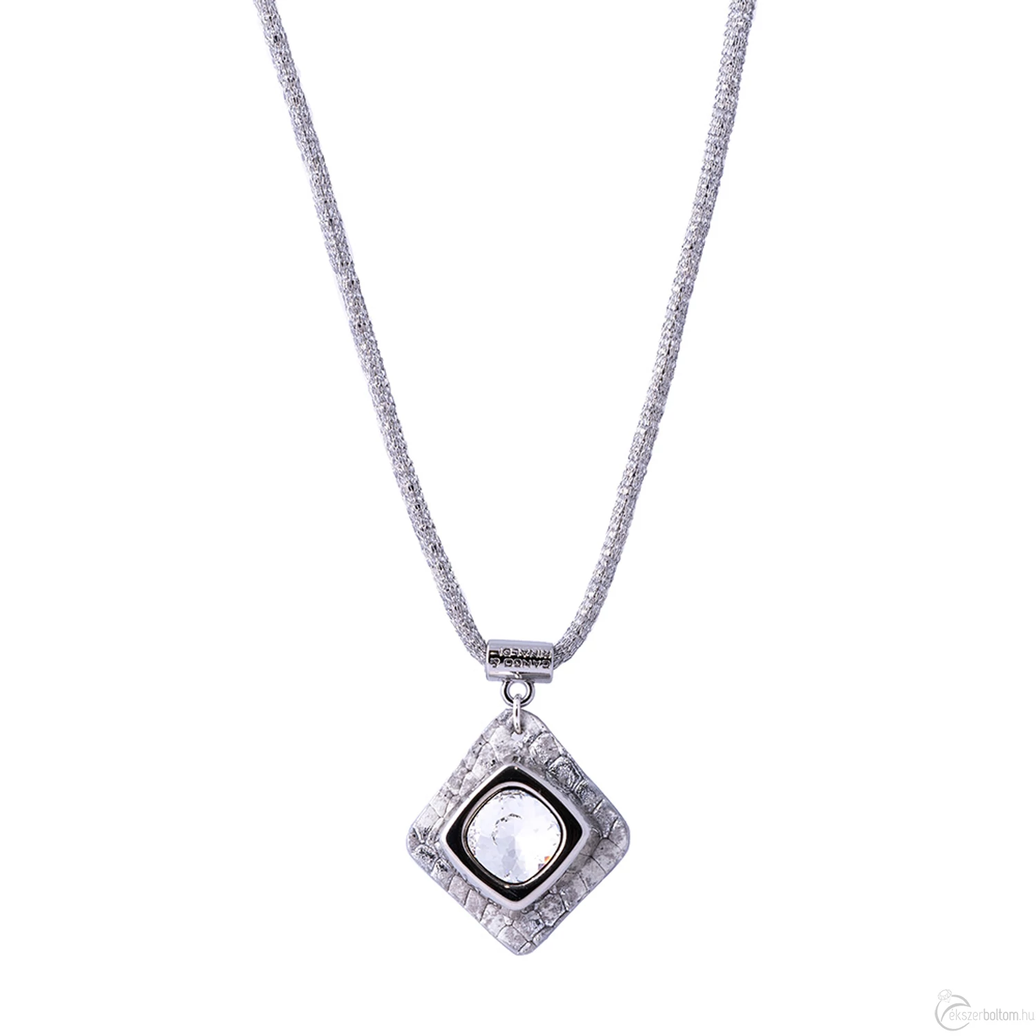 Cango & Rinaldi Cube ezüst színű nyaklánc ezüst színű fém dísszel és hálós Calza lánccal, kristály kővel. Hengeres mágneszárral záródik, 45 cm hosszú. A bőr mintázata részleteiben eltérhet a képen láthatótól.