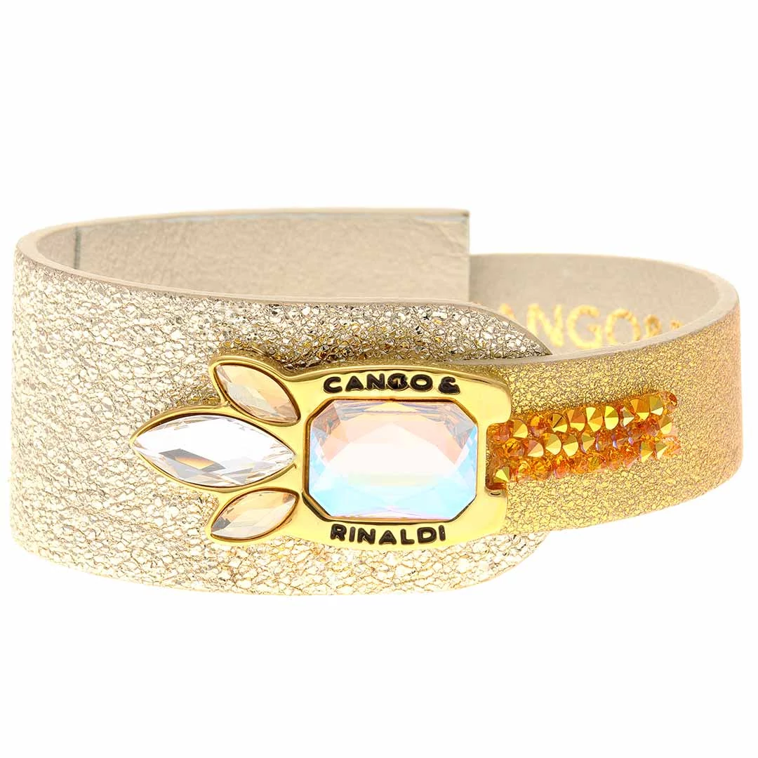 Cango & Rinaldi Lilly arany mintás bőr karkötő nonfiguratív díszes rátéttel készült. Minőségi olasz bőrrel, arany színű fémkellékkel. Rajta Cango & Rinaldi márkajelzés van. Benne arany AB és fehér színű Swarovski kővel.
