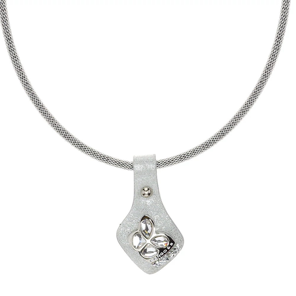 Cango & Rinaldi Secret Garden ezüst színű matt bőr nyaklánc. Minőségi olasz bőrrel, ezüst színű, pillangó formájú fémkellékkel készült. Rajta Cango & R márkajelzés van. Benne fehér színű Swarovski kővel. Illetve a felirat mellett egy fehér-ezüst szórt kősorral van díszítve.