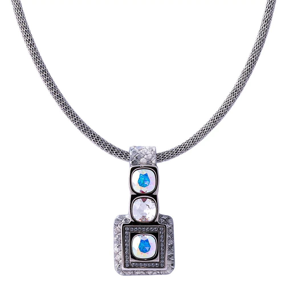 Cango & Rinaldi Cube ezüst színű nyaklánc ezüst színű fém dísszel és hálós Calza lánccal, kristály és színjátszó Aurora Borealis kővel. Hengeres mágneszárral záródik, 45 cm hosszú. A bőr mintázata részleteiben eltérhet a képen láthatótól.