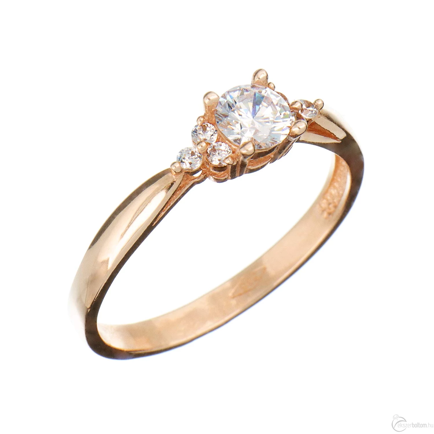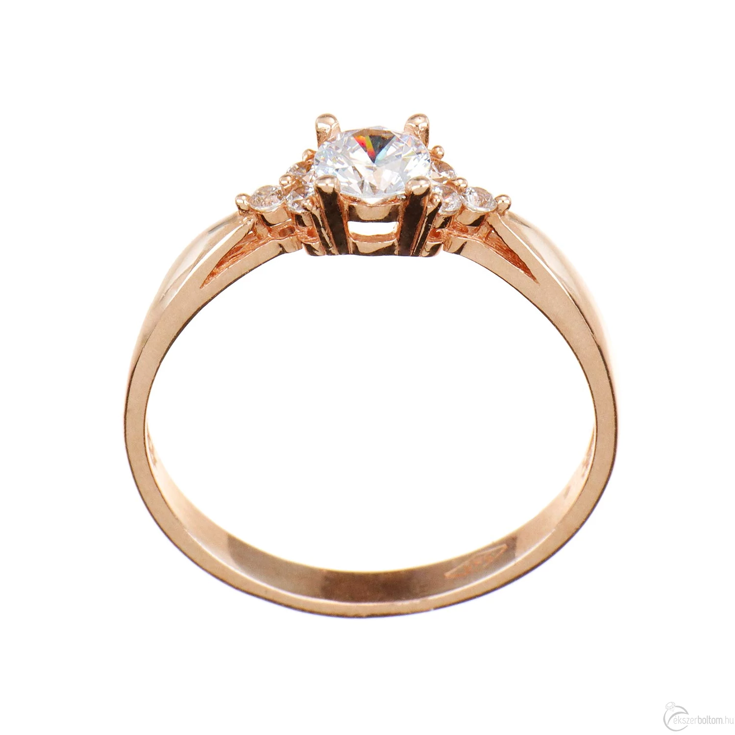 Egy nagy és hat kisebb köves eljegyzési gyűrű (más néven leánykérő vagy kísérő gyűrű) karmos foglalatokkal, 14 karátos rozé aranyból. A gyűrűsín egyenes, klasszikusan elegáns kivitel. A széles, lapos gyűrűsín révén a viselése nagyon kényelmes. A karmos kialakítás ellenállóbbá teszi az ékszert, így az még jobban viseli a mindennapos használatot.