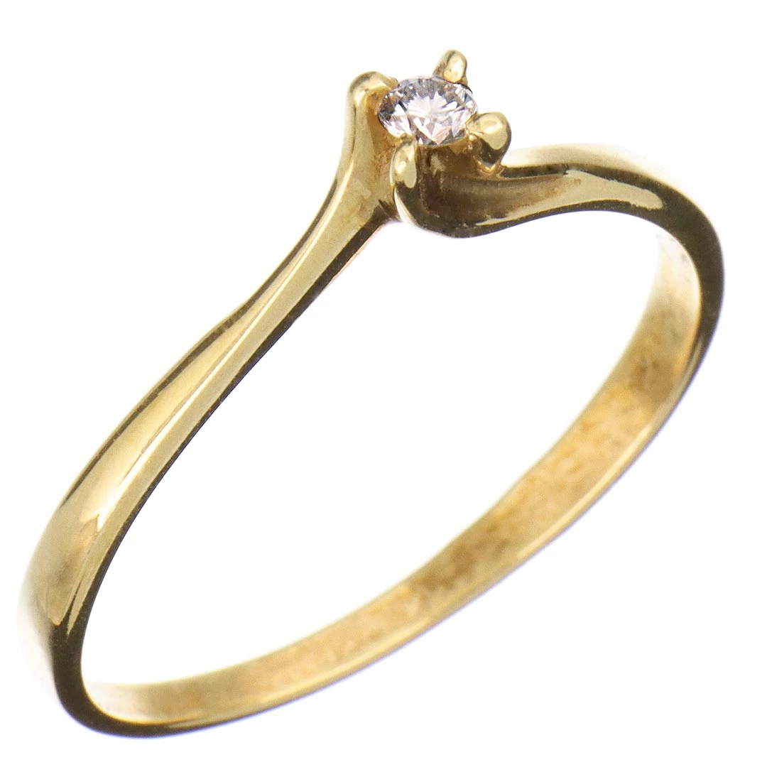 Gyémánt eljegyzési gyűrű 14 karátos sárga arany – szoliter (57-es méret). A négykarmos csavart foglalat megfelelő csillogást biztosít a briliáns csiszolású gyémánt kőnek. A 2,4 mm átmérőjű briliáns 0,05 karát súlyú.