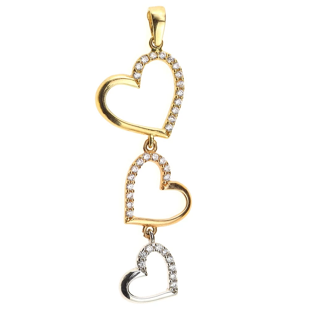 Három, egymáshoz kapcsolódó szív sárga, rozé és fehér aranyból, fehér cirkónia kövekkel. A külon belső átmérője 2,1 mm. Vékony velencei vagy anker láncon mutat legszebben.