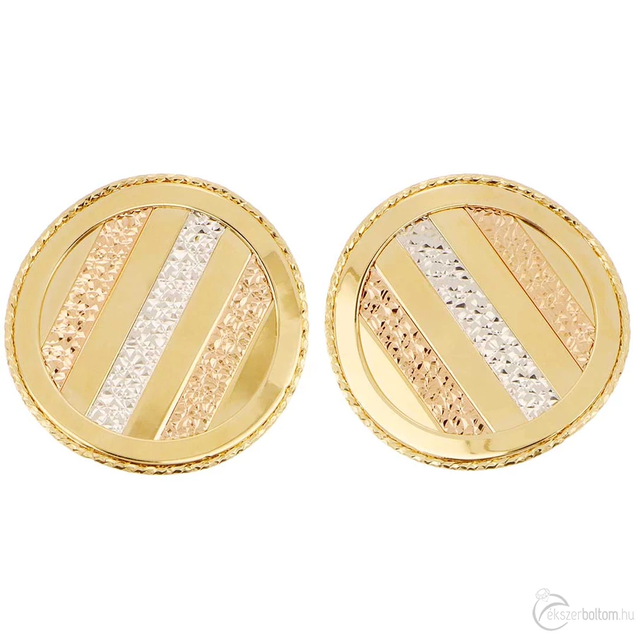 Kerek bedugós trikolor vésett fülbevaló 14 kt aranyból, 6,45 g