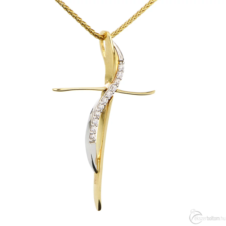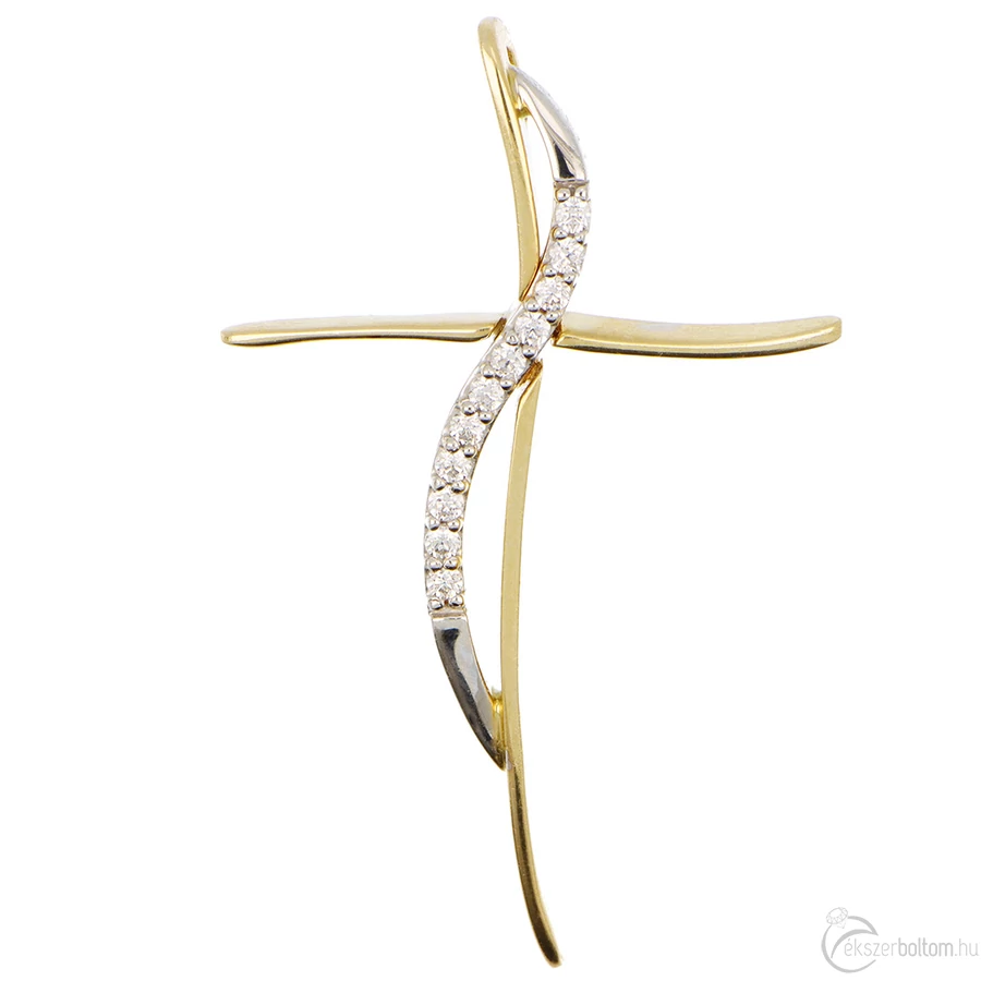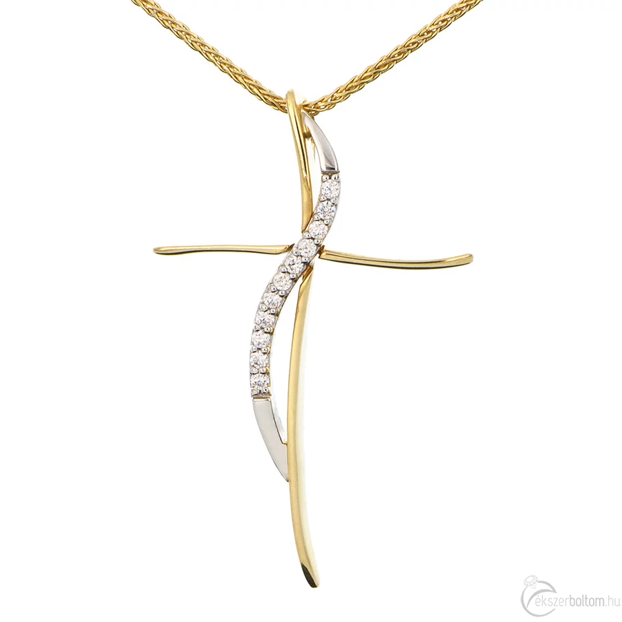 Ívelt kereszt medál fehér sokköves szalaggal 14 kt aranyból, 2,07 g