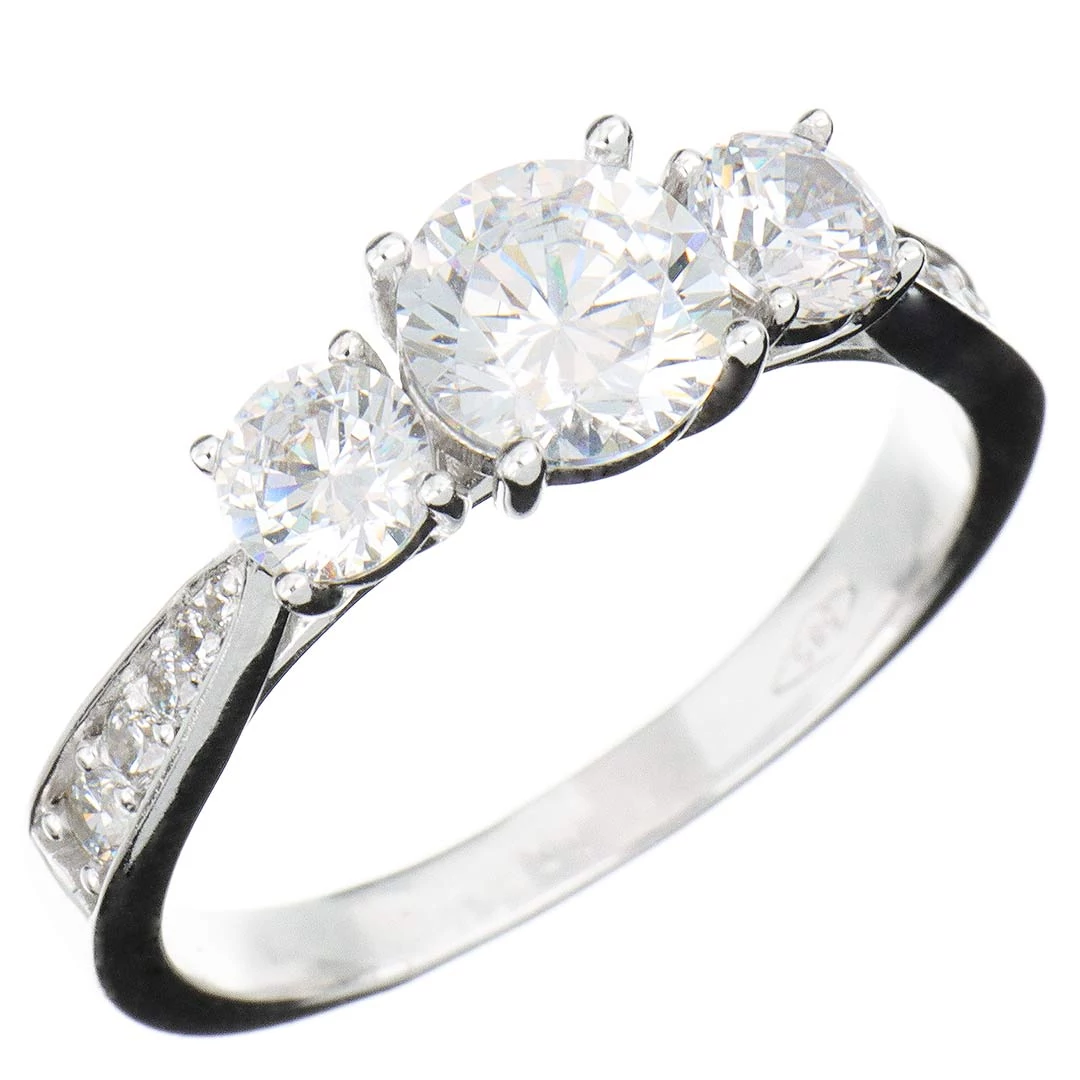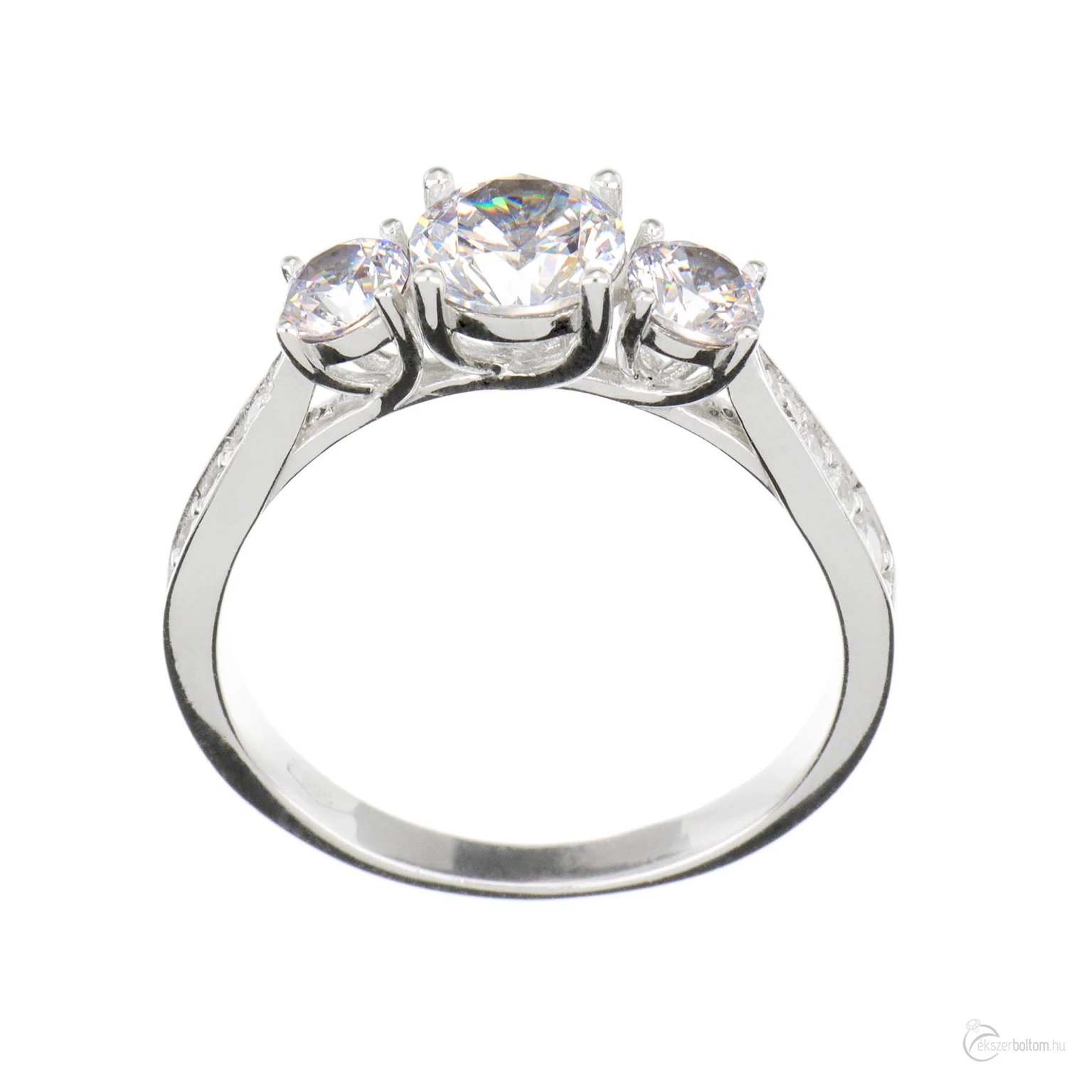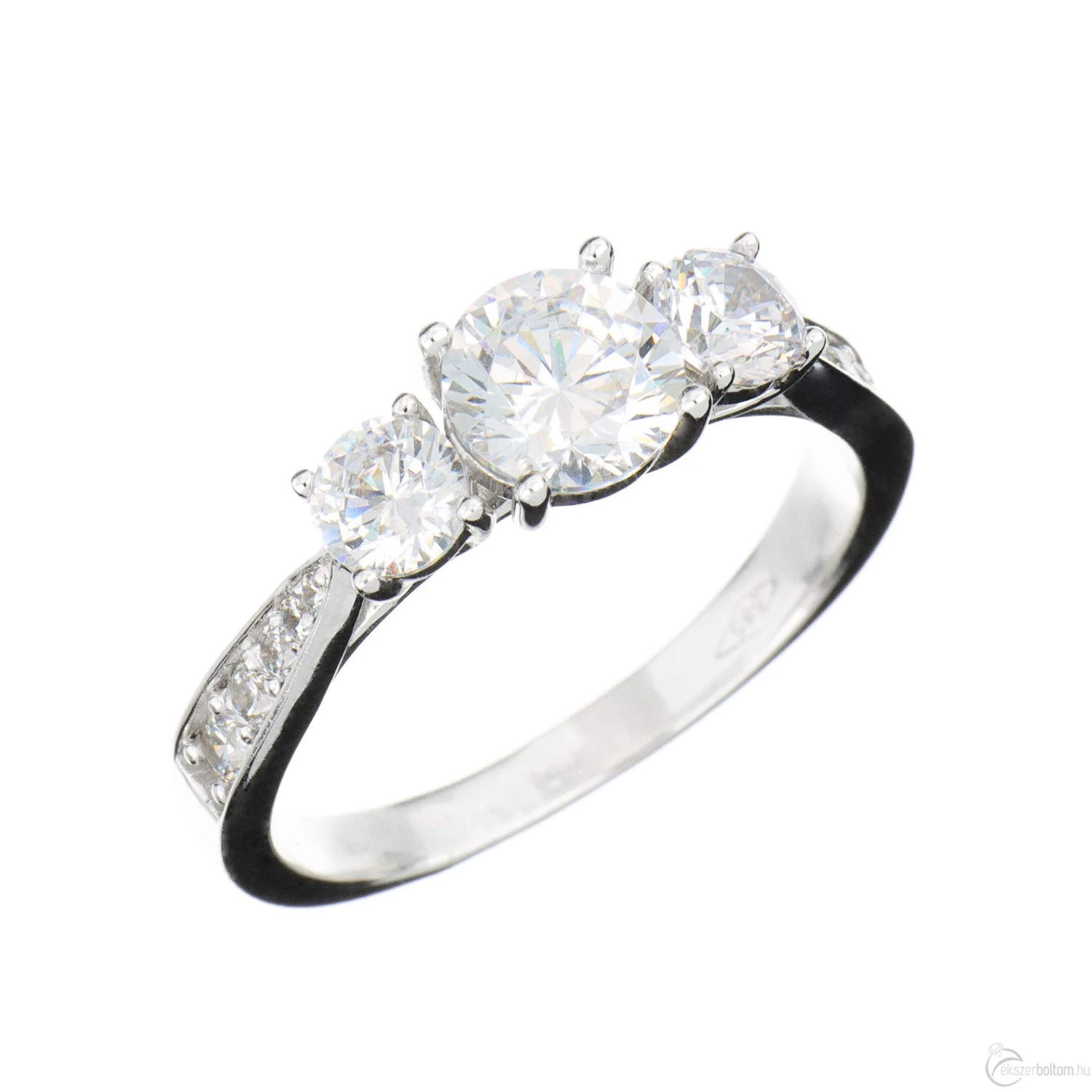 Három nagy és tíz kisebb köves eljegyzési gyűrű (más néven leánykérő, szoliter vagy kísérő gyűrű) ívelt vonalú karmos foglalatokkal, 14 karátos fehér aranyból. A gyűrűsín klasszikusan elegáns kivitel, a fej oldalsó-alsó részén a foglalat karmai egzotikus, egymásba fűződő íveket alkotnak. A széles, lendületes gyűrűsín révén a viselése nagyon kényelmes. A karmos kialakítás ellenállóbbá teszi az ékszert, így az még jobban viseli a mindennapos használatot.