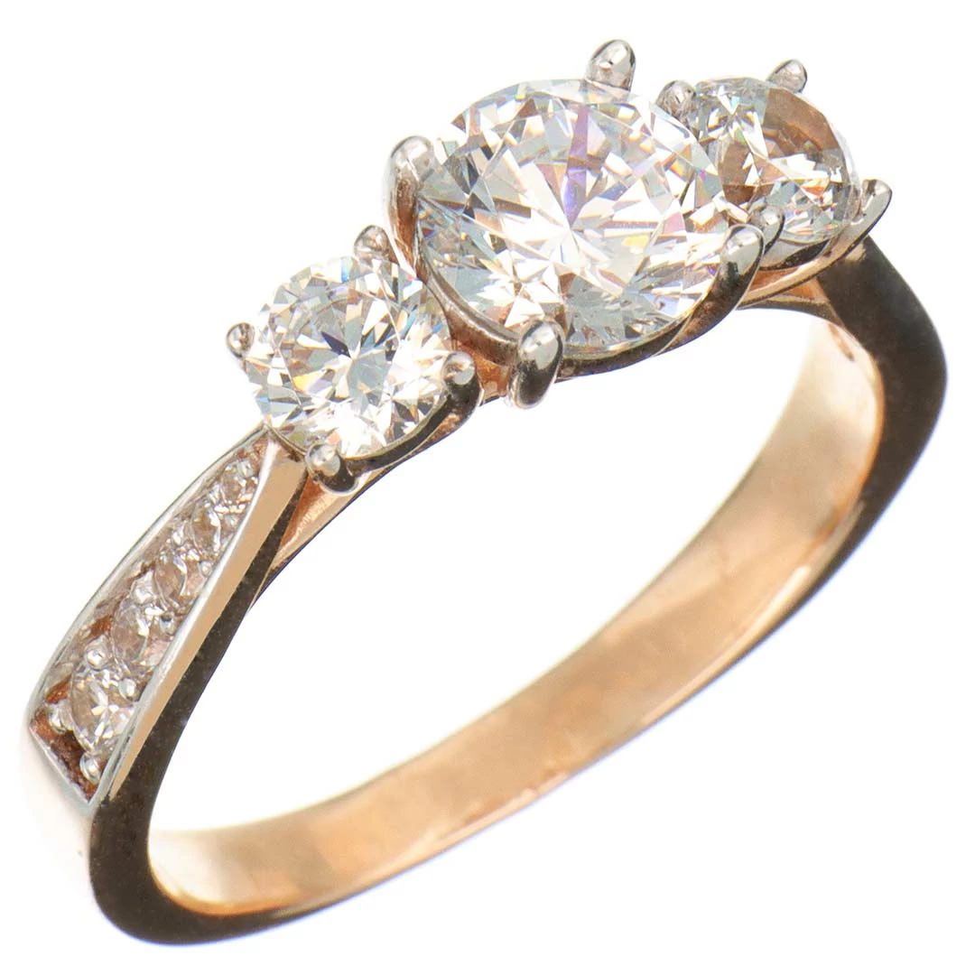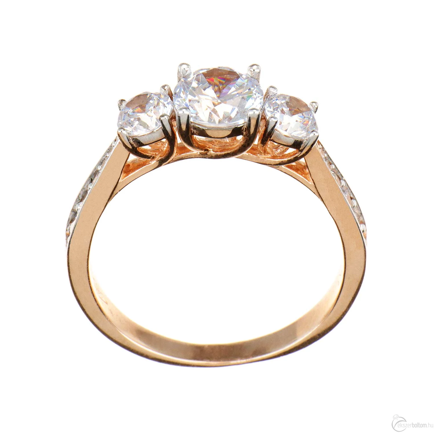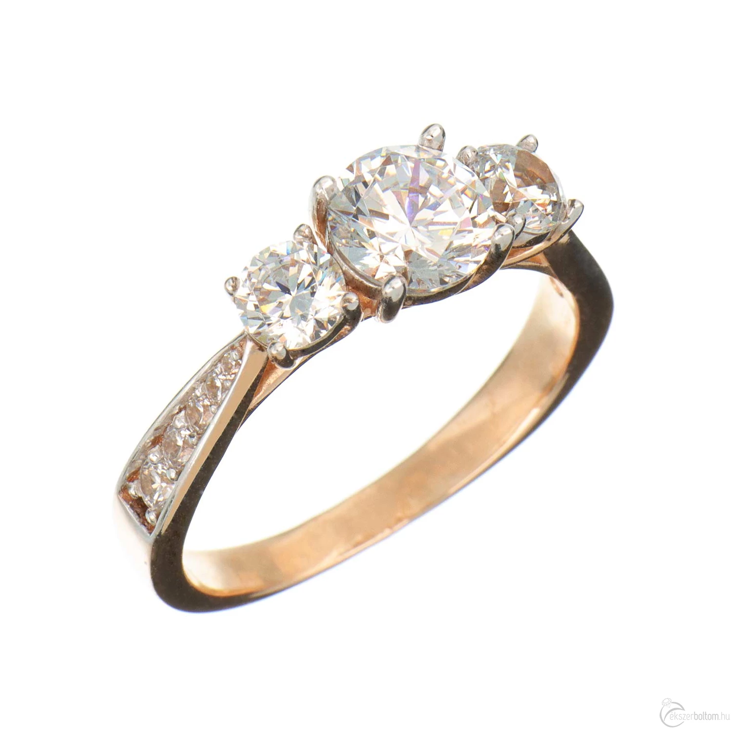 Három nagy és tíz kisebb köves eljegyzési gyűrű (más néven leánykérő, szoliter vagy kísérő gyűrű) ívelt vonalú karmos foglalatokkal, 14 karátos rozé aranyból. A gyűrűsín klasszikusan elegáns kivitel, a bele foglalt kövek körül fehérarany színűre ródiumozott. A fej oldalsó-alsó részén a foglalat karmai egzotikus, egymásba fűződő íveket alkotnak. A széles, lendületes gyűrűsín révén a viselése nagyon kényelmes. A karmos kialakítás ellenállóbbá teszi az ékszert, így az még jobban viseli a mindennapos használatot.