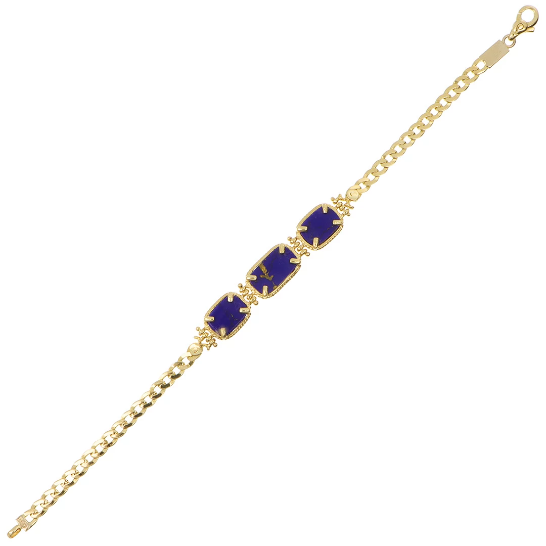 Könnyű, lapított ovális pancer láncból készült karkötő 14 karátos sárga aranyból, középső szakaszán csuklósan illeszkedő keretes, karmos foglalatban téglalap alakú valódi kék lapis lazuli drágakő betétekkel. A három betét a csuklós kialakítása miatt nagyon kényelmesen, finoman fekszik ki, és elfordulásra sem olyan hajlamos, mint a hasonló, valódi kő betétes társai. A lapított ovális pancer lánc viszonylag nagy felülete természetes súrlódása révén ellensúlyozza a kövek forgató hatását, ráadásul nagyon finoman és lazán fekszik fel a karra, tovább javítva a komfortot. A drágakő valódi volta miatt a kő betéteken erezetek, minták, kisebb színeltérések jelentkezhetnek, amit a gyártó gondos válogatással igyekszik minimálisra korlátozni.
