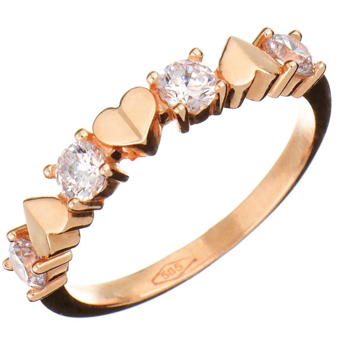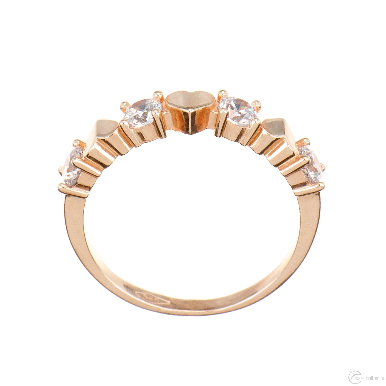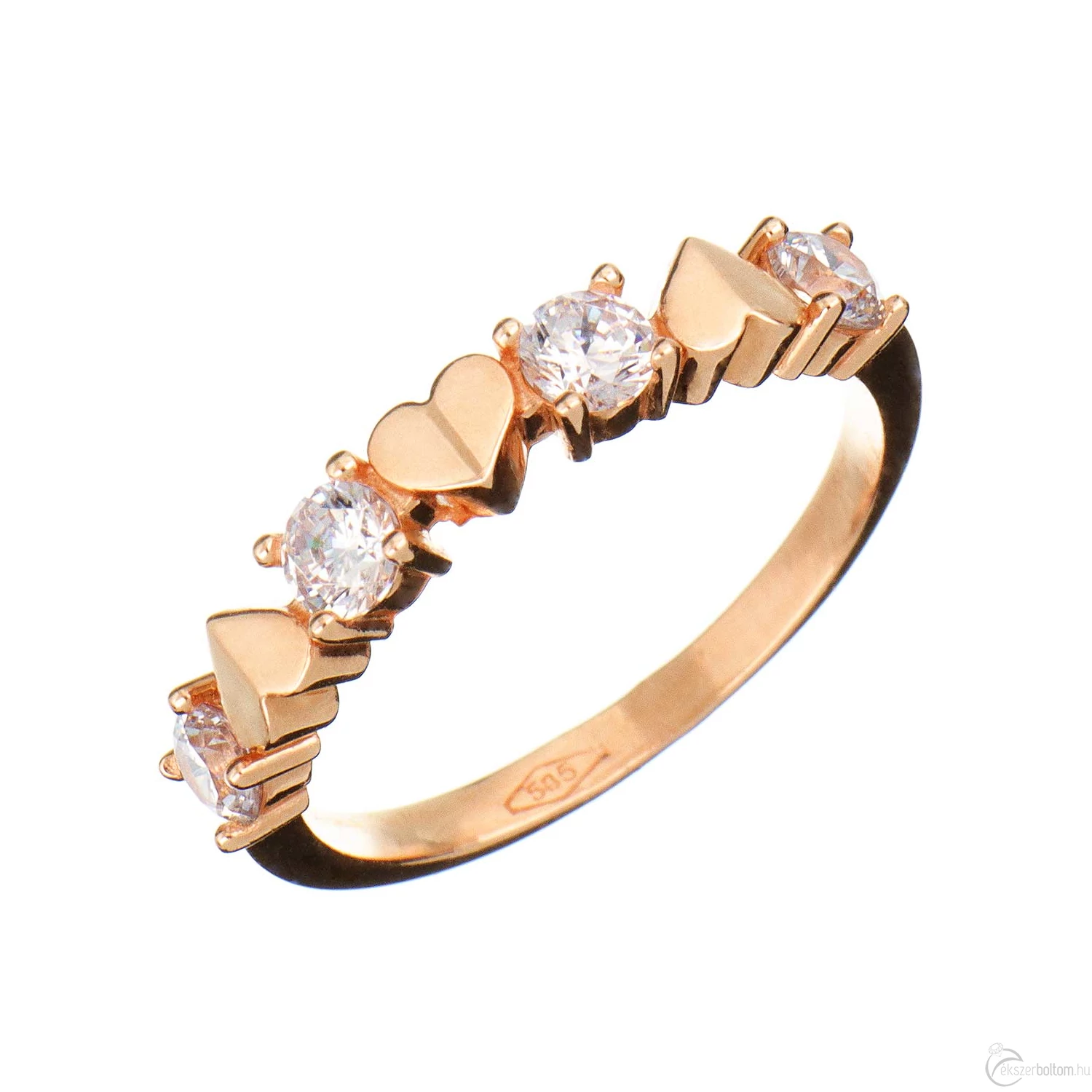 Négy köves szoliter gyűrű (más néven leánykérő vagy kísérő gyűrű) karmos foglalatokkal, 14 karátos rozé (vörös, avagy rózsa) aranyból. A köveket váltakozó állású kis, szív alakú díszítés választja el egymástól. A gyűrűsín könnyű, finom és vékony kivitel. Kedves, játékos, és nagyon kényelmes. A karmos kialakítás ellenállóbbá teszi az ékszert, így az még jobban viseli a mindennapos használatot.