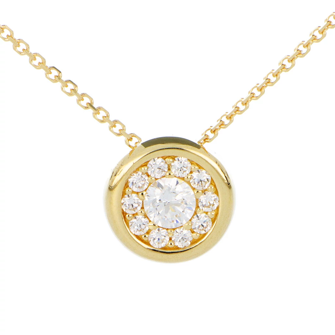 Bájosan finom, 14 karátos sárga arany medál egy nagyobb és sok kisebb, kerek fehér cirkónia kővel. E kövek fénye megközelíti a gyémántét, csak a keménységében, éleinek rajzosságában és árában van feltűnő különbség. A medálon a kövek koncentrikus mintát alkotnak. A vékony 14 karátos sárga anker lánc forrasztással fixen rögzített és ruggyűrűvel záródik. Két állásban, 42 cm-es és 45 cm-es hosszon kapcsolható be.