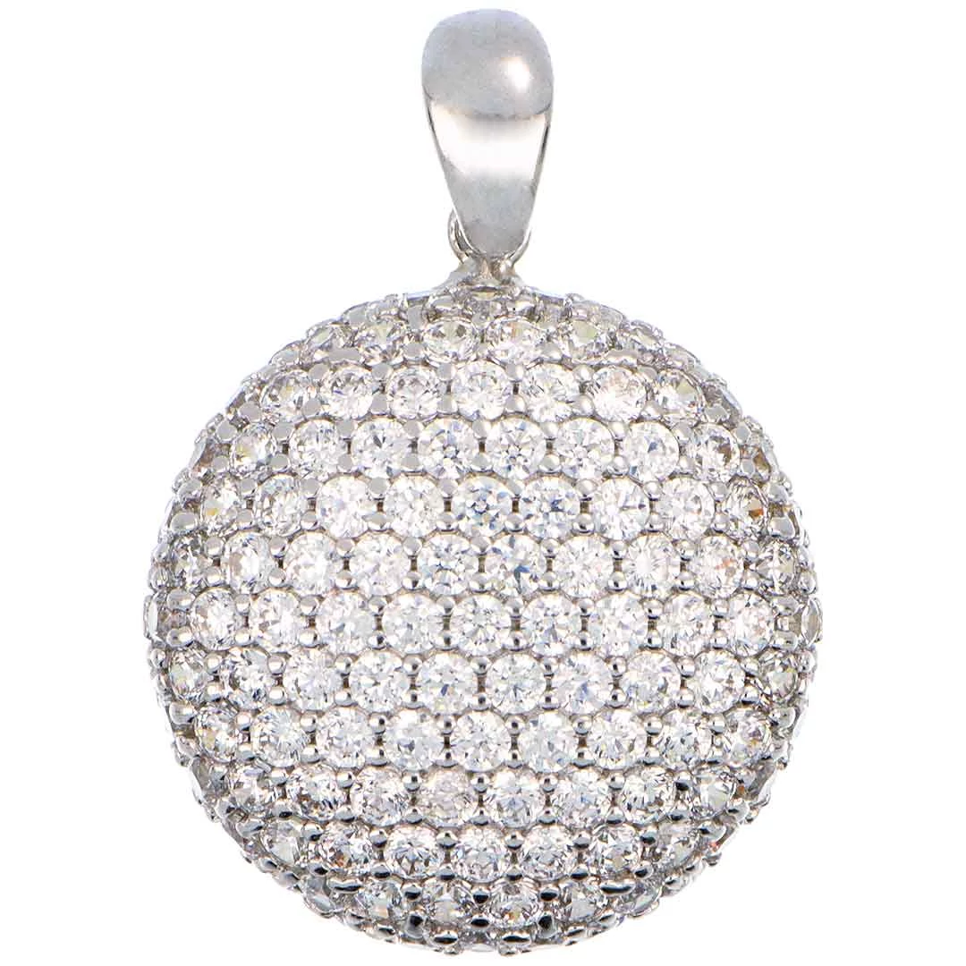 A teljes felületén kerek fehér cirkónia kövekkel kirakott domború, kerek "lencse" medál. A kövek karmos foglalatban vannak, ami a legbiztosabb rögzítést nyújtja. Sziporkázó felülete csodálatos kiegészítővé teszi kisebb alkalmakra, vagy különösen elegáns munkához. A külon 3,6 mm-es átmérőig tud láncot fogadni. Elsősorban 2,5–5 g körüli barbara vagy esetleg valesz láncot javaslunk hozzá.