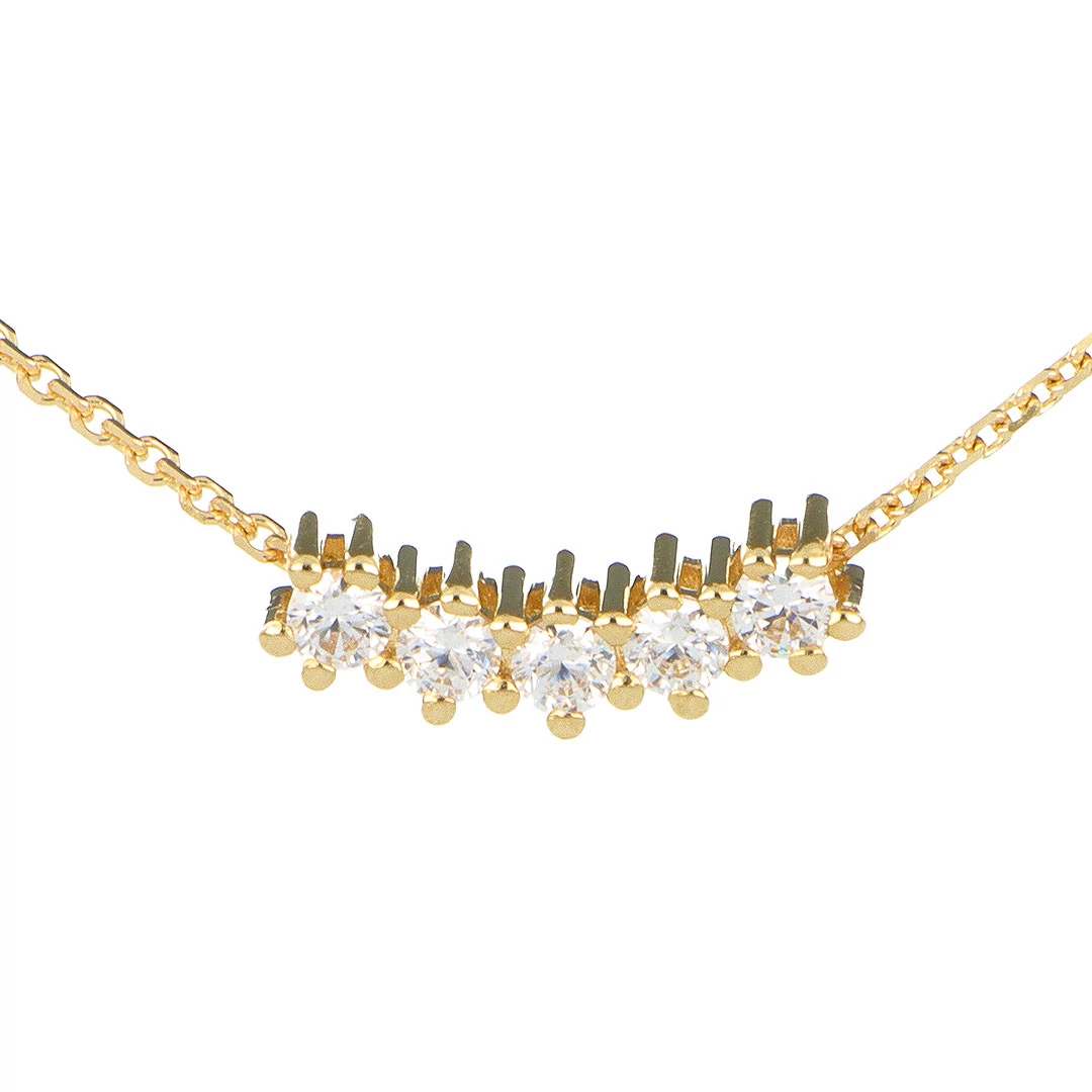 Egyszerű és szép, 14 karátos sárga arany medál ívelt sorba rendezett karmos foglalatban 5 kis fehér cirkónia kővel. Ez a fajta foglalat biztosítja a legjobban a kövek épségét. A kő fénye megközelíti a gyémántét, csak a keménységében, éleinek rajzosságában és árában van feltűnő különbség. A vékony 14 karátos sárga anker lánc forrasztással fixen rögzített és ruggyűrűvel záródik. Két állásban, 42 cm-es és 45 cm-es hosszon kapcsolható be. A képeken és videón kissé előre bukva látható, de ez a kialakítás biztosítja, hogy viselésekor a dekoltázson a legideálisabb helyzetben, kövekkel előre felé feküdjön ki.