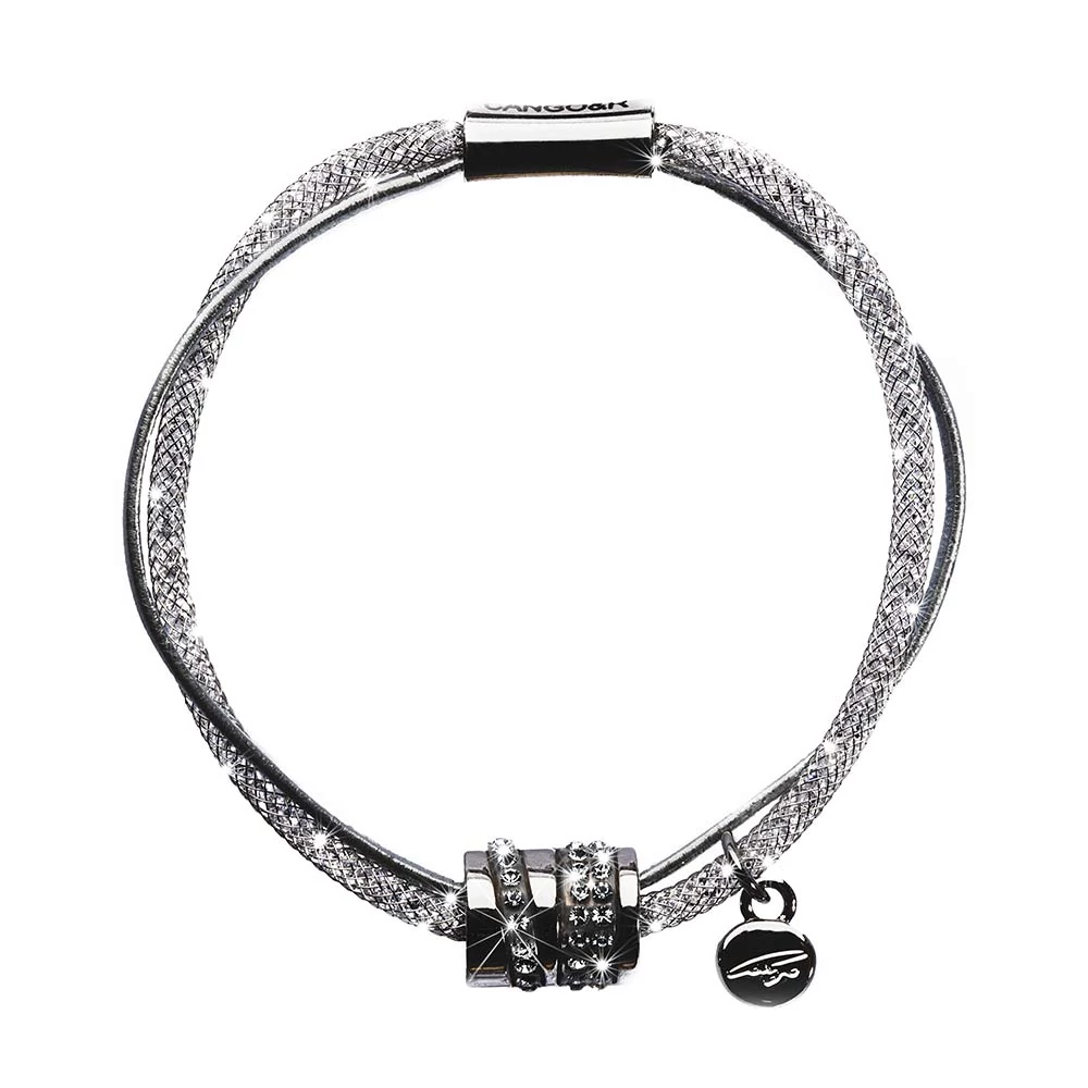 A Cango & Rinaldi Stardust kollekciójához tartozó szép karkötő a finom fémhálóba zárt csillogó kövekkel, finom bőr pánttal és kristályokkal kirakott medállal ékesít. Henger formájú mágneses zárja biztosan tart.