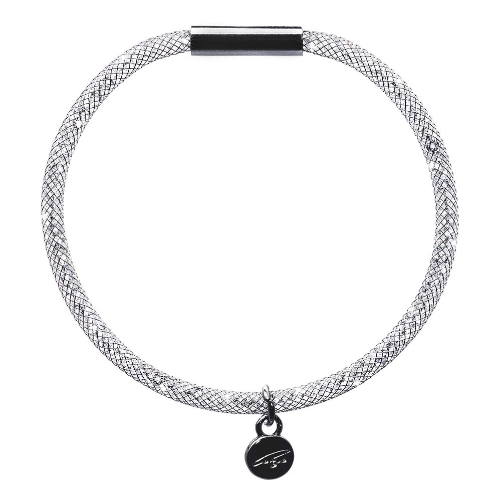 A Cango & Rinaldi Stardust kollekciójához tartozó szép karkötő a finom fémhálóba zárt csillogó kövekkel ékesít. Henger formájú mágneses zárja biztosan tart. Az apró kerek medál a Cango logóval díszített.