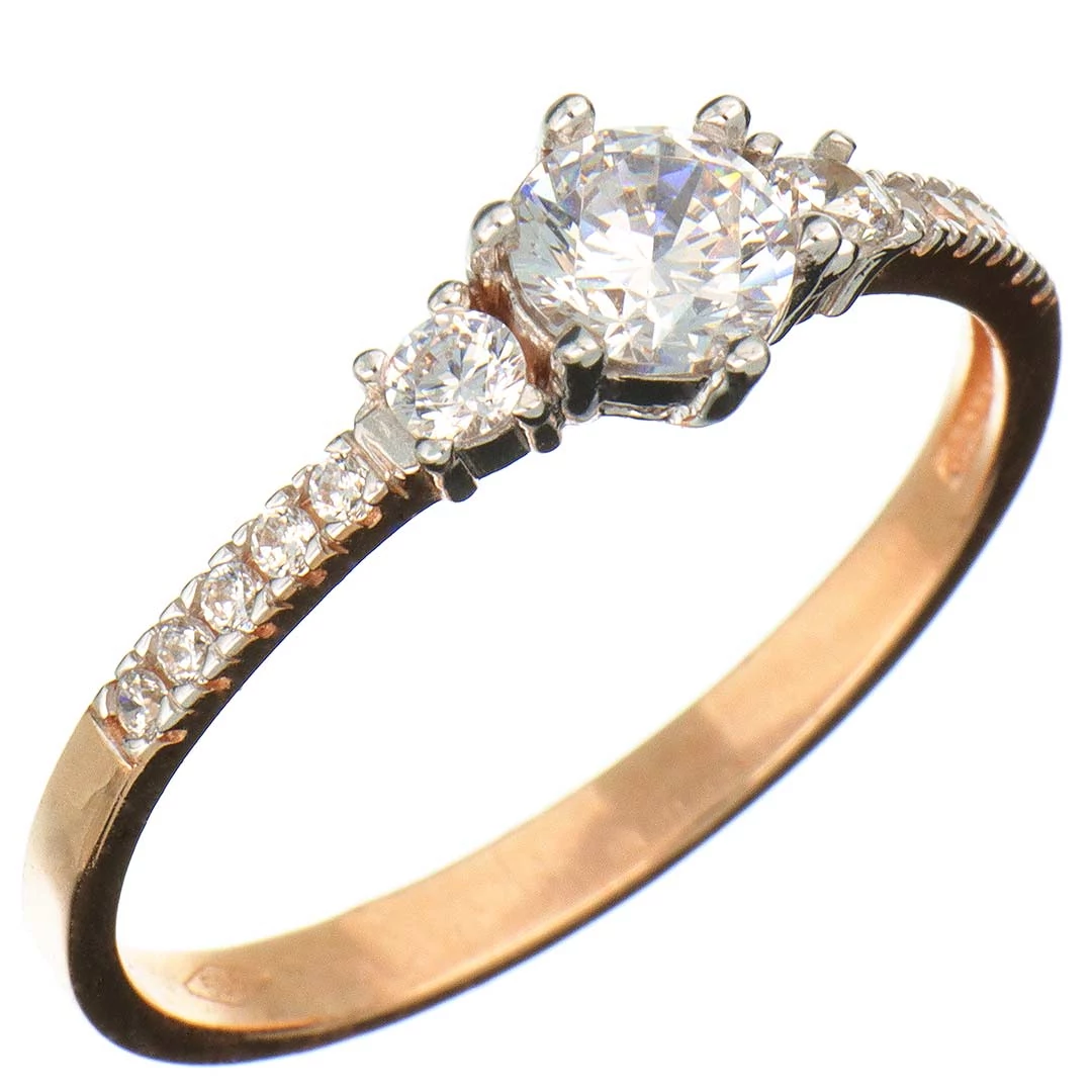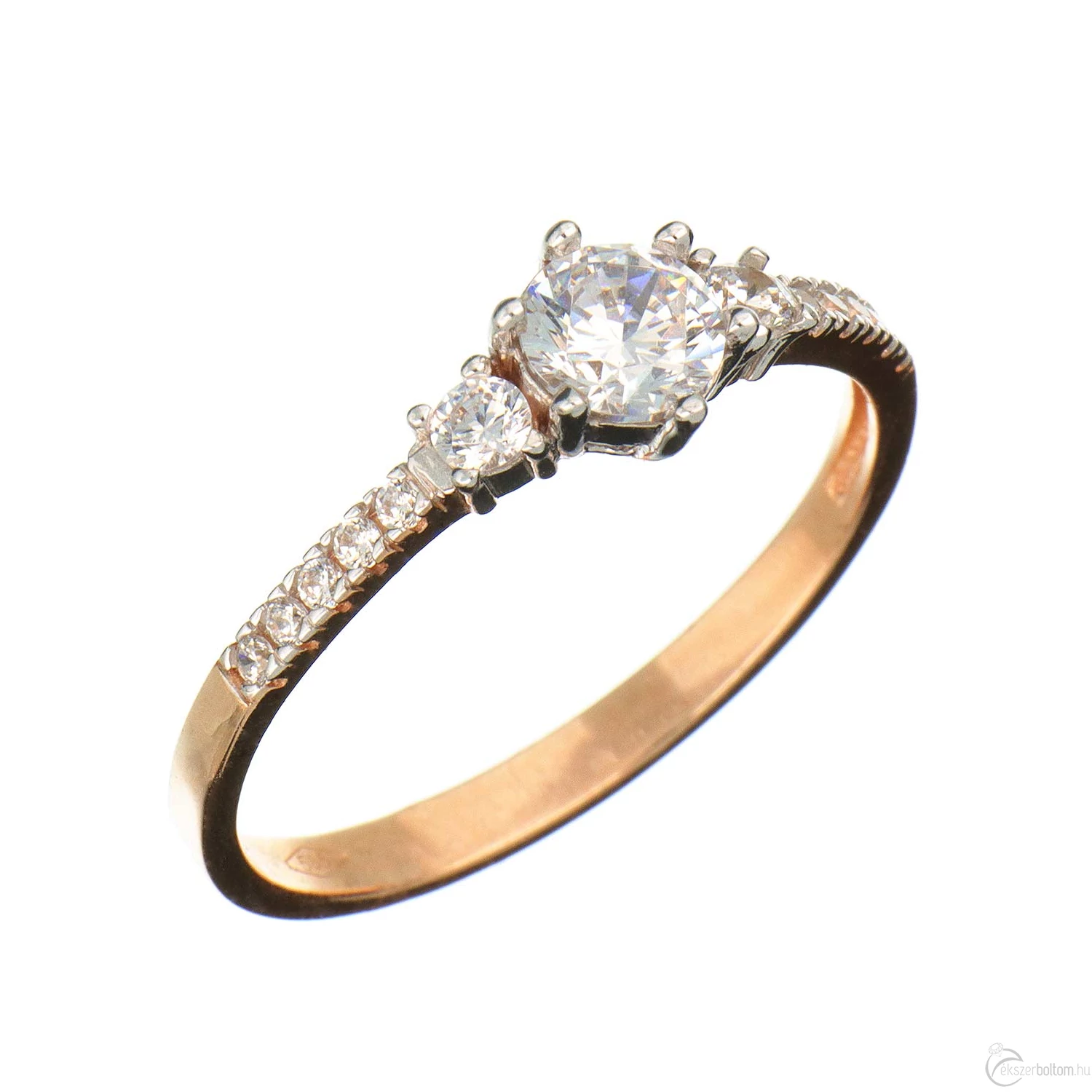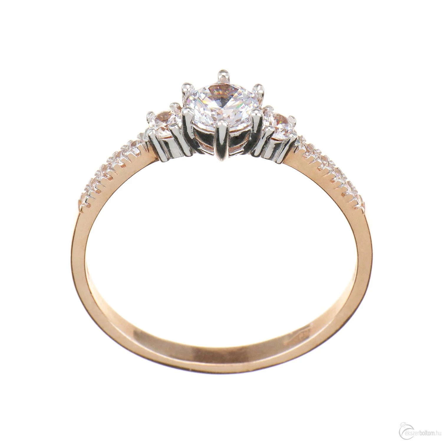 A fejrészén egy nagyobb és két kisebb, a sínen oldalanként 5–5, karmos foglalatú köves eljegyzési gyűrű (más néven leánykérő vagy kísérő gyűrű), 14 karátos vörös (rozé, rózsa) aranyból. A kisebb köveket négykarmos foglalat tartja, a legnagyobb követ még jobb tartást biztosító hatkarmos foglalat rögzíti. A középső kövek foglalatának karmai a kő színének kiemelése érdekében fehérarany színűre ródiumozottak. A foglalatok kialakítása ellenállóbbá teszi az ékszert, így az még jobban viseli a mindennapos használatot.